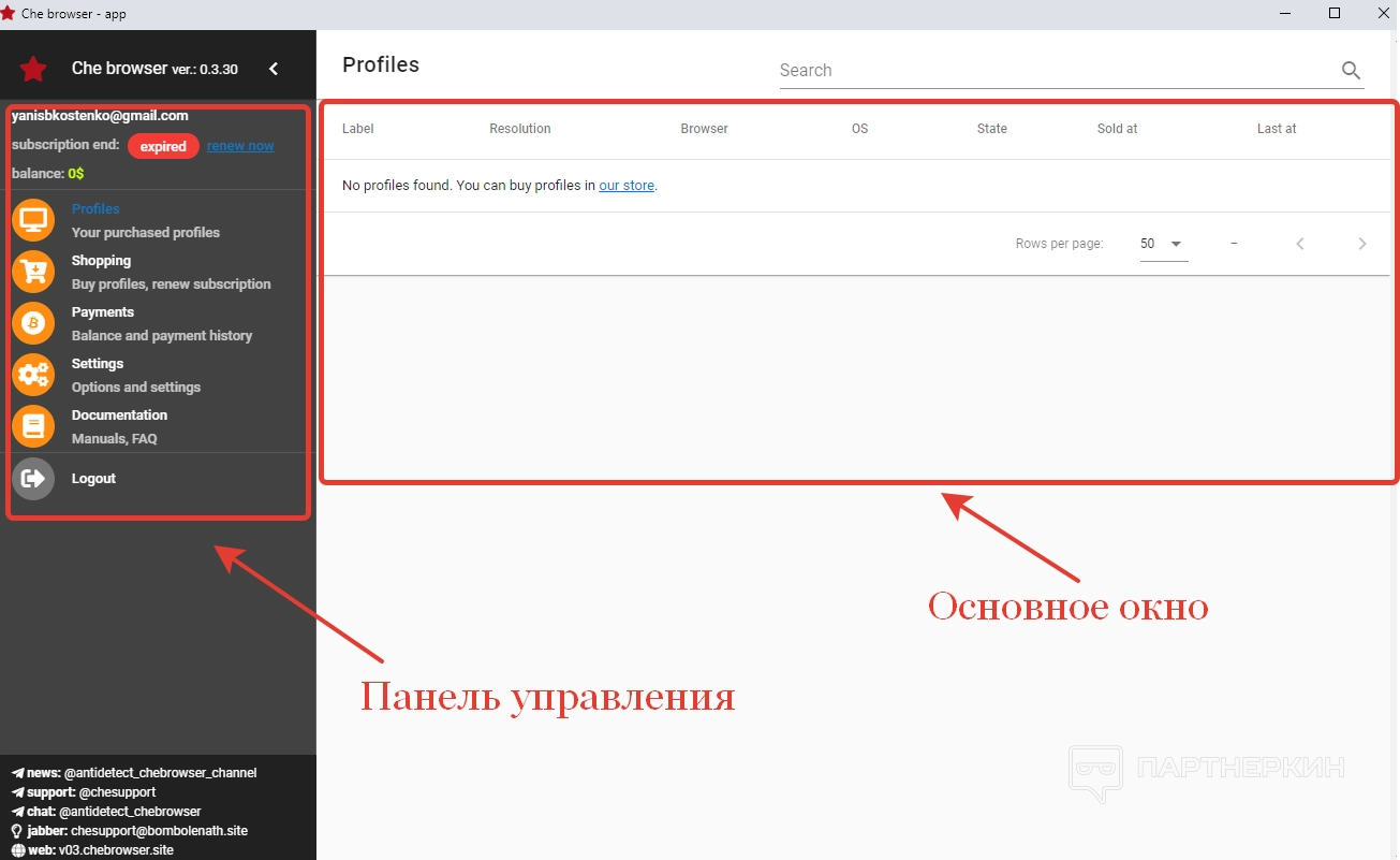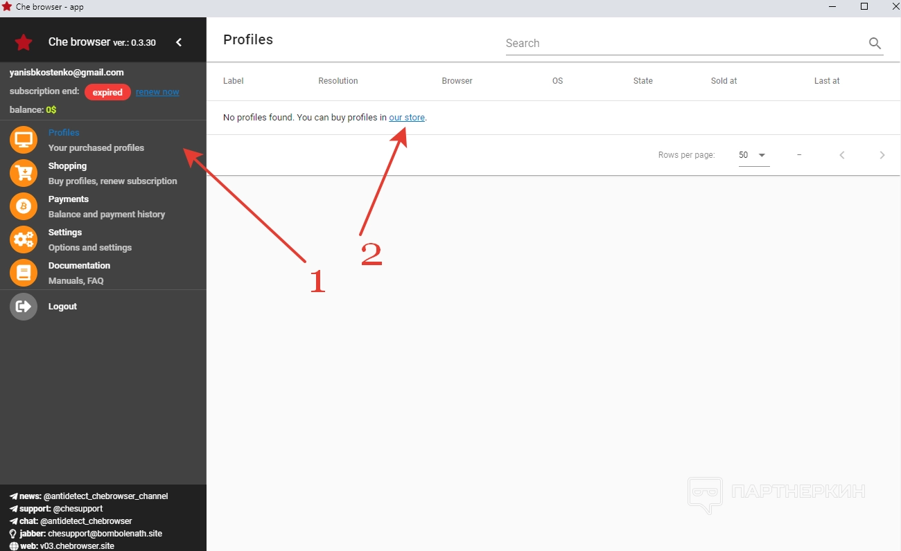 Когда загрузка будет завершена, перед пользователем откроется рабочее окно антидетект-браузера. Приступить к анонимной работе с веб-сайтами можно будет сразу после запуска профиля. Учетная запись здесь не настраивается, как во многих других антидетект-браузерах. Единственный выход — приобрести заранее настроенный профиль в сервисе. Для этого нужно открыть раздел «Profiles» и кликнуть на кнопку «our store».
