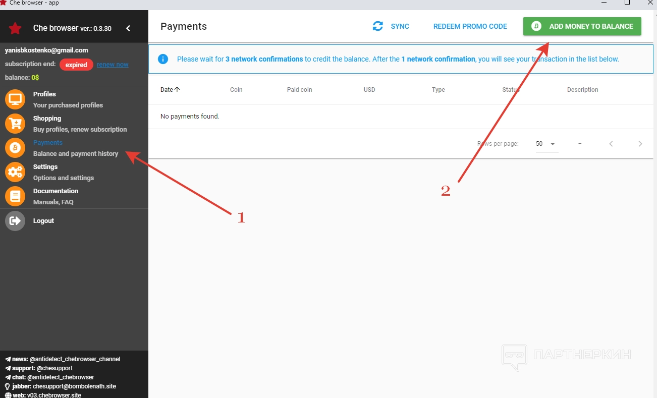 Во вкладке «Payments» осуществляются все платежи. Чтобы пополнить счет, переходим в эту вкладку, жмем в верхней части экрана «Add money» и вводим необходимую сумму. На момент написания статьи пополнять счет можно было только криптовалютой.