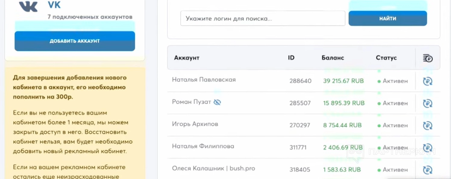 После добавления источника трафика, например VK, профили будут в меню справа. Каждому профилю присваивается название, ID, информация по балансу, статус. С помощью кнопки с иконкой рубля можно пополнять или выводить средства.