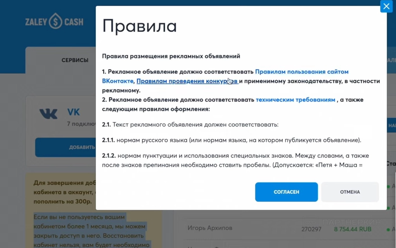 Если пользователь не заходит в кабинет более 1 месяца, сервис закрывает доступ, поскольку для ZaleyCash это означает, что кабинет больше не нужен. Если в этом случае на балансе остались неизрасходованные средства, они переводятся в новый кабинет или выводятся на WebMoney по запросу.