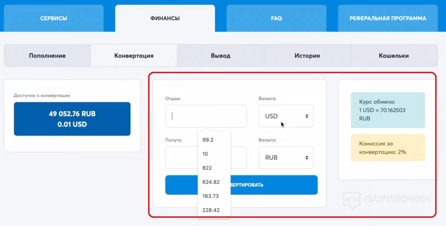 - конвертировать валюты с долларов на рубли и обратно, курсы и комиссии указываются рядом;