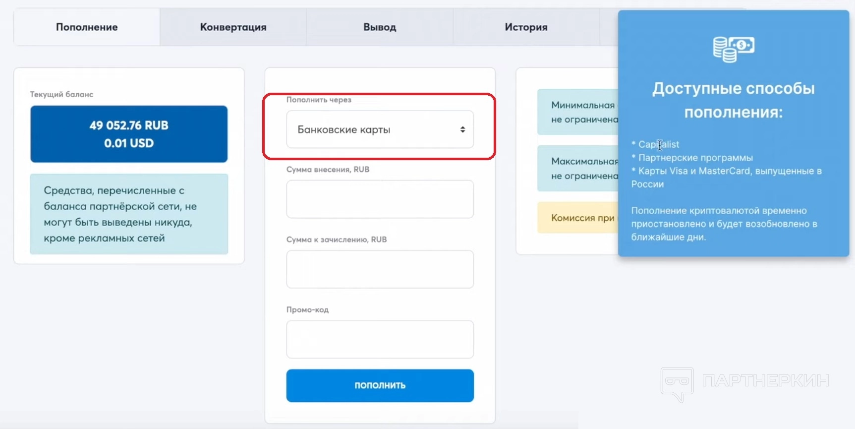 - Возможность вносить средства на счета рекламных кабинетов с баланса в партнерских сетях.