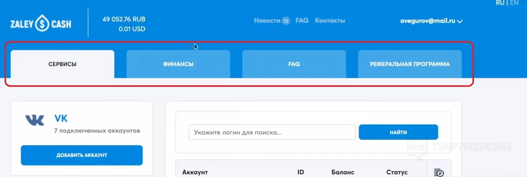 Раздел «Сервисы» включает рекламные и соцсети, инструменты, промоакции, опции для пополнения счета. В этом разделе можно подключить нужный аккаунт.