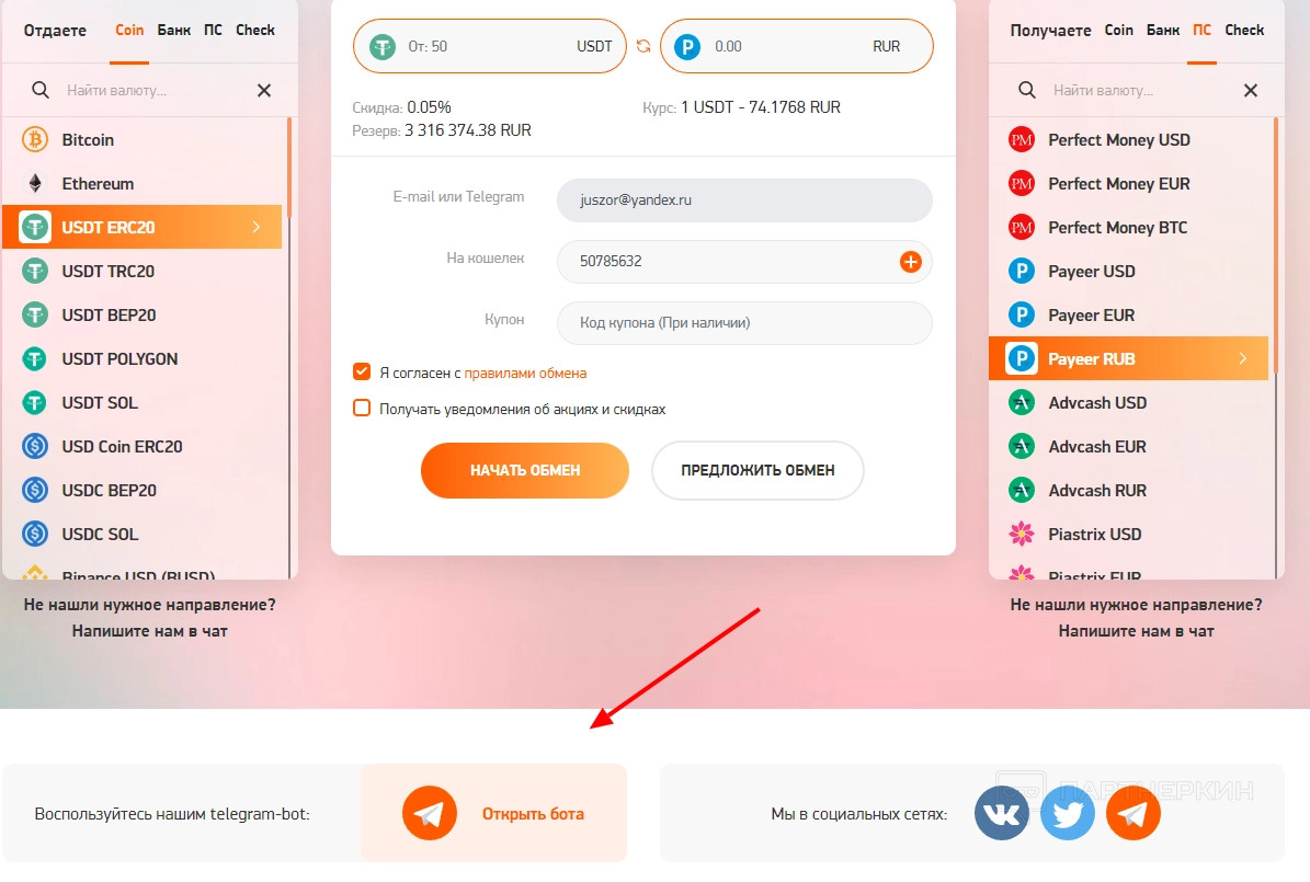 Пользователь может совершать финансовые операции через телеграм-бота. Чтобы запустить его, на главной странице официального сайта нужно нажать кнопку «Открыть бота» (рядом с пунктом меню «Воспользуйтесь нашим telegram-bot):