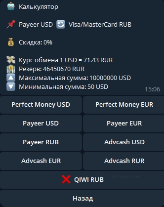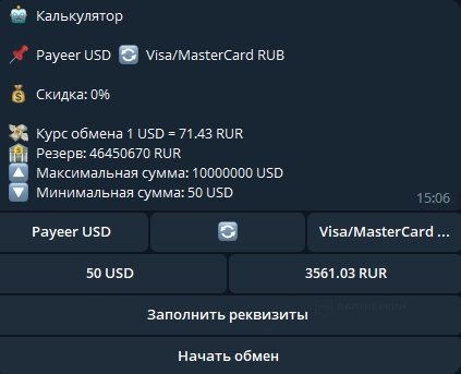Здесь представлена информация по скидке, курсу обмена, доступный резерв, максимальная и минимальная сумма. На этом примере пользователь хочет обменять 50 USD на 3 561 рубль.