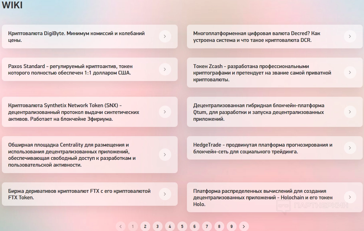 Здесь размещен каталог полезных статей. Заголовки некоторых публикаций — «Многоплатформенная цифровая валюта Decred? Как устроена система и что такое криптовалюта DCR», «HedgeTrade — продвинутая платформа прогнозирования и блокчейн-сеть для социального трейдинга».