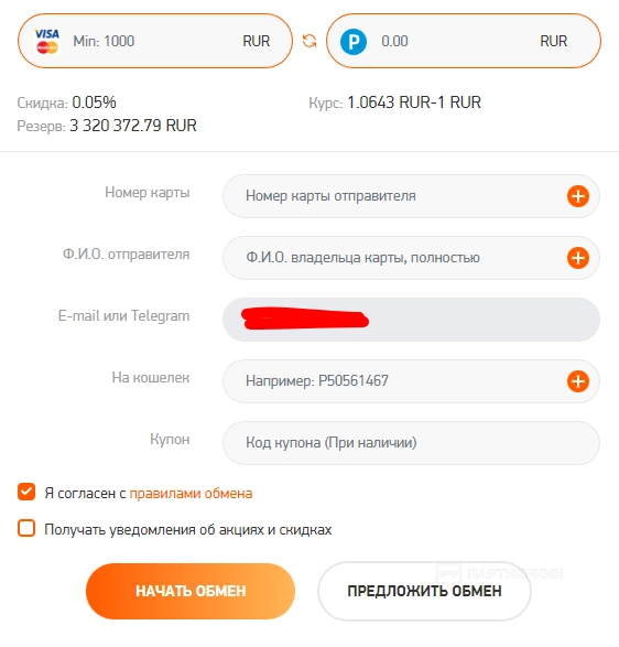 После заполнения полей нужно согласиться с правилами обмена и нажать кнопку «Начать обмен» (дополнительно можно поставить галочку в пункте «Получать уведомление об акциях и скидках»). Что будет дальше: