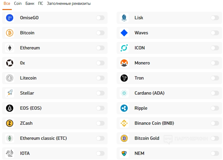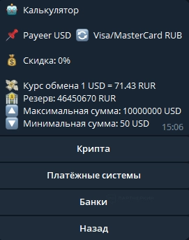 - Выбрать один из трех пунктов меню — крипта, платежные системы или банки (например, второй вариант).