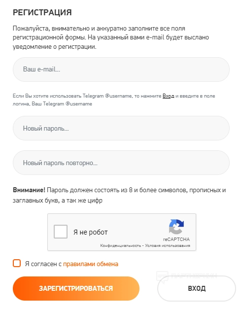 После заполнения полей нужно пройти проверку «Я не робот» и поставить галочку в пункте «Я согласен с правилами обмена».