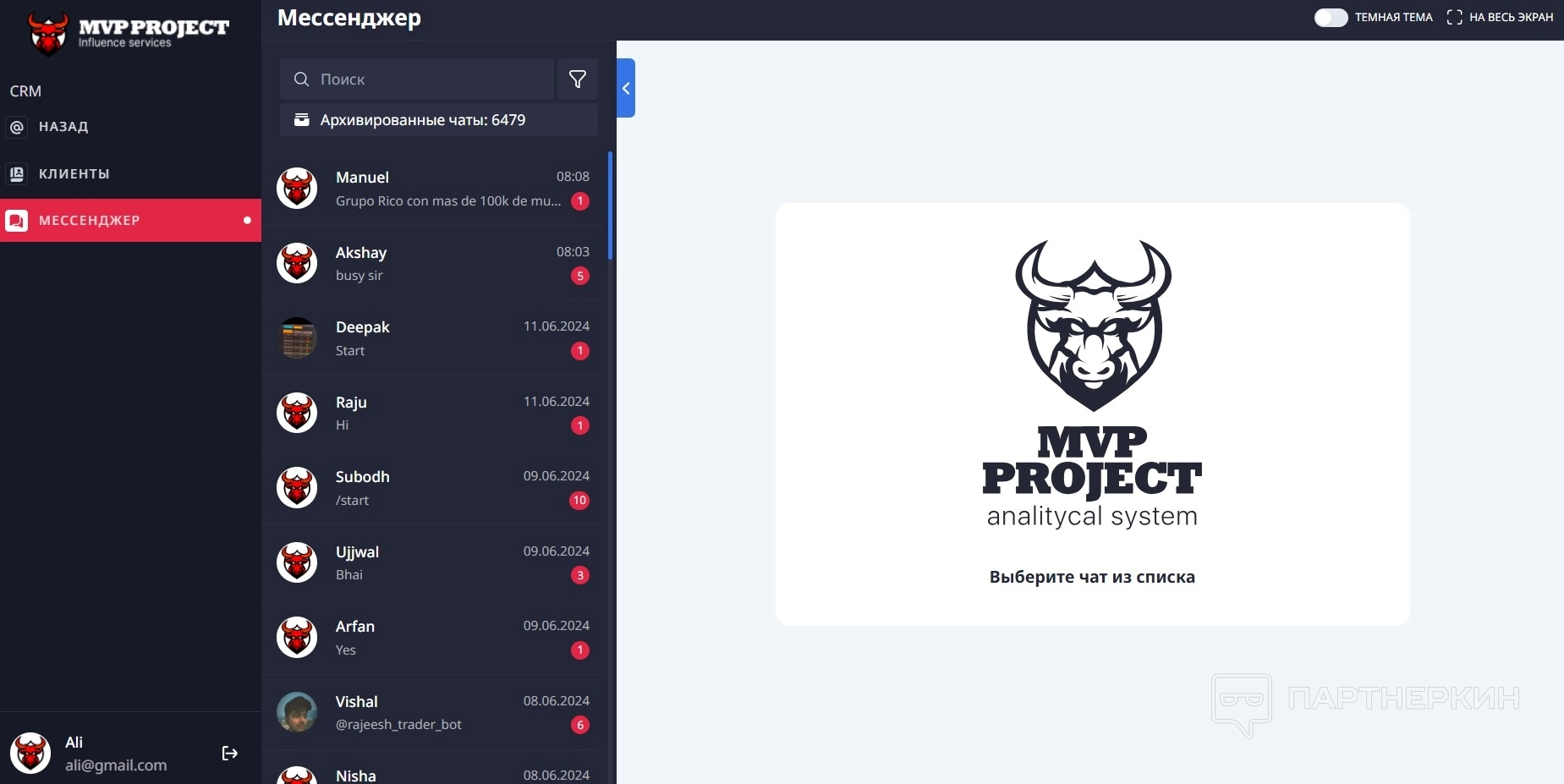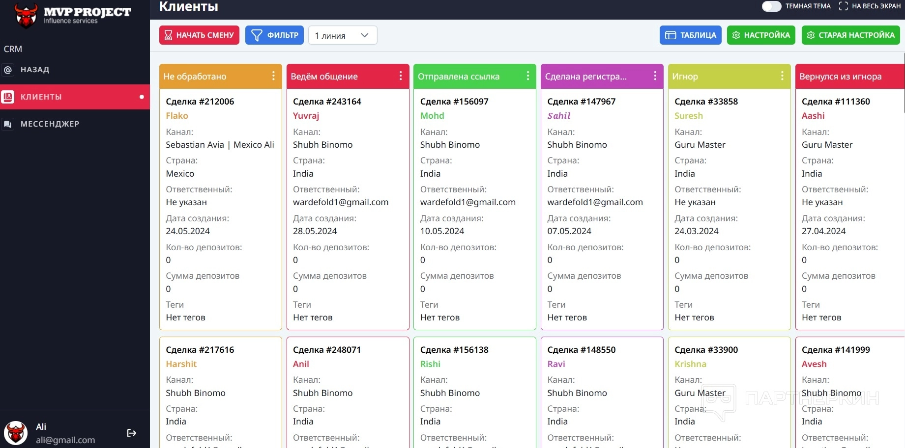 Также MVP Project имеет собственную встроенную CRM-систему. Она помогает отслеживать информацию по каждому игроку или лиду в окне мессенджера — есть ли регистрация, депозит, количество депозитов, сумма. Вся информация об игроке находится в карточке клиента и подтягивается автоматически постбеками. Есть мобильная версия CRM.