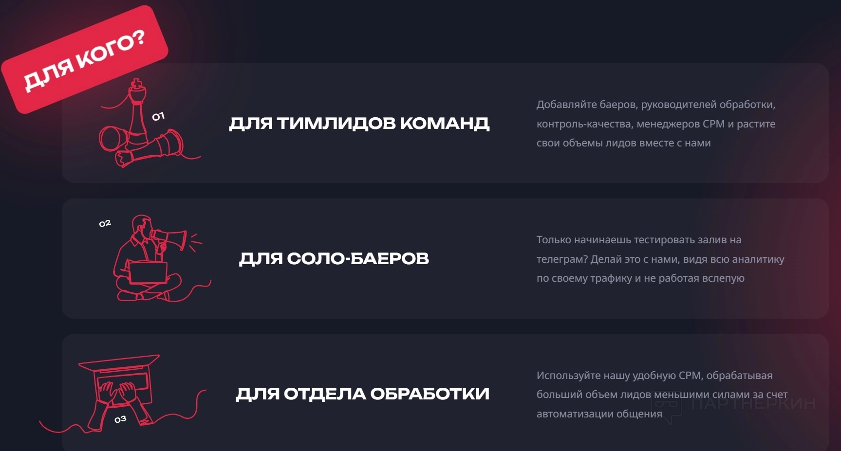 - Тимлиды арбитражных команд. Сервис поддерживает командный доступ: тимлид может добавлять байеров, руководителей обработки, менеджеров CRM и контроля качества.