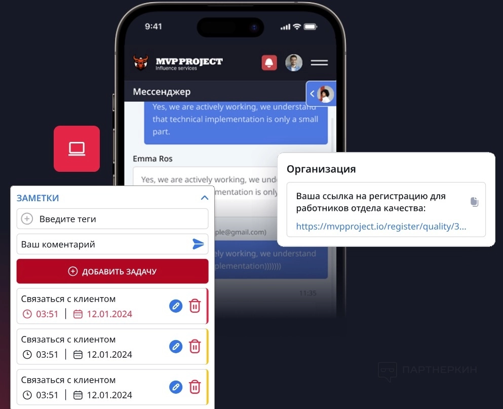 - Отдел обработки. CRM-система, которую предлагает MVP Project, помогает обрабатывать больший объем лидов меньшими силами за счет автоматизации общения.