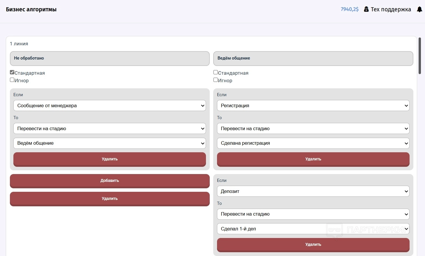 Отдельный блок меню посвящен встроенной CRM. В разделе с Бизнес логикой можно управлять и настраивать бизнес-алгоритмы: