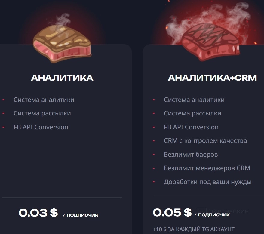 - Тариф Аналитика+CRM включает систему аналитики, рассылки, FB API Conversion, CRM с контролем качества, безлимит байеров и менеджеров CRM, возможность доработок под потребности бизнеса. Стоимость — $0,05 за подписчика и $10 за каждый Telegram-аккаунт.