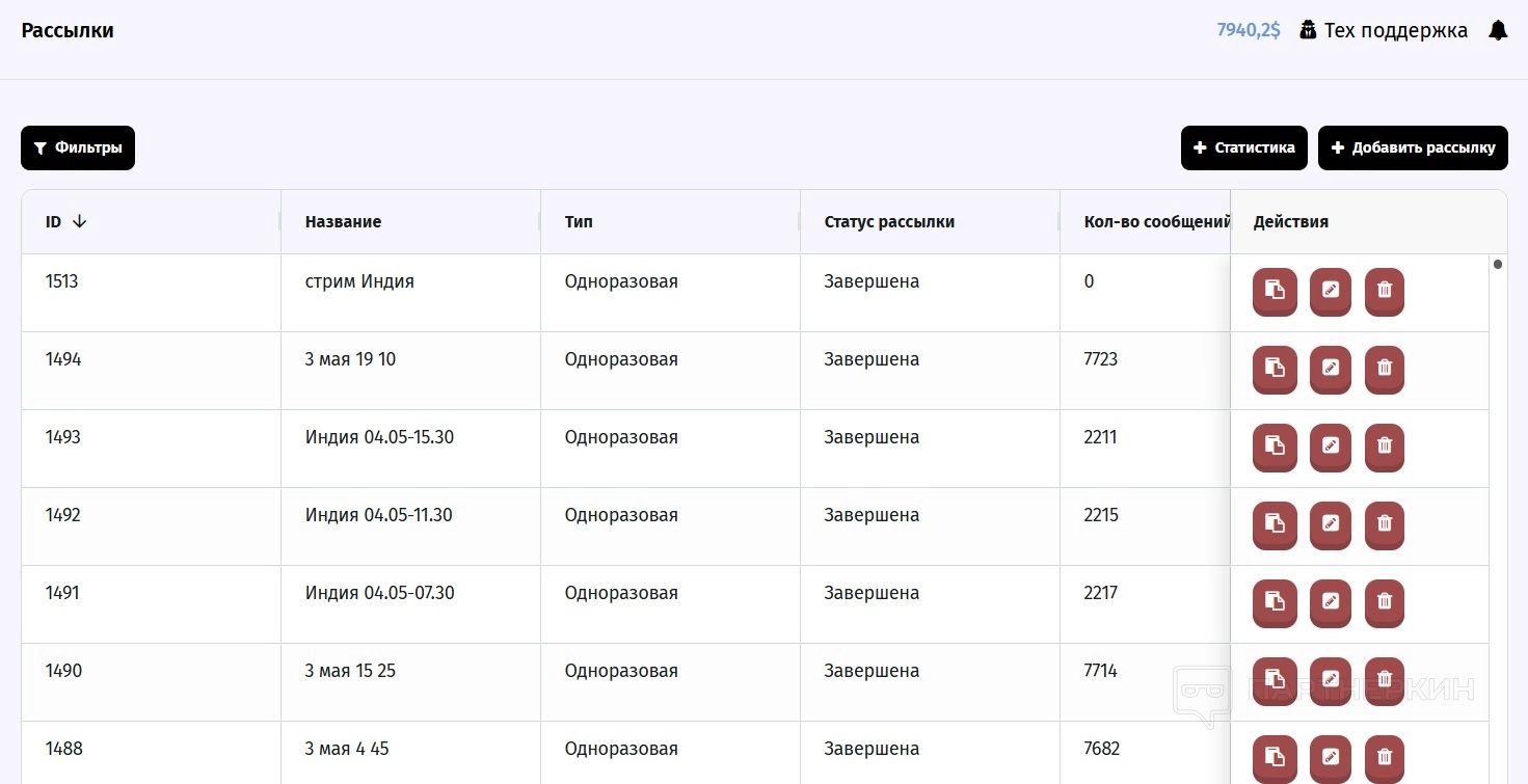 - Делать рассылки по боту с учетом статуса клиента — Подписка, Регистрация, Депозит, Отписка, с возможностью смотреть эффективность каждой рассылки и количество откликов на рассылку. Благодаря этой опции можно получить больше диалогов за одно и то же действие.