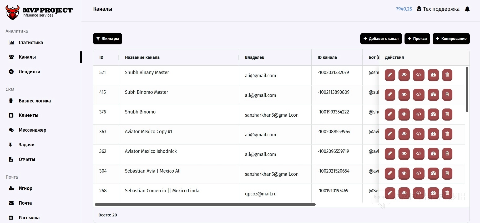 В разделе с каналами доступен дашборд с опцией управления ТГ-каналами: