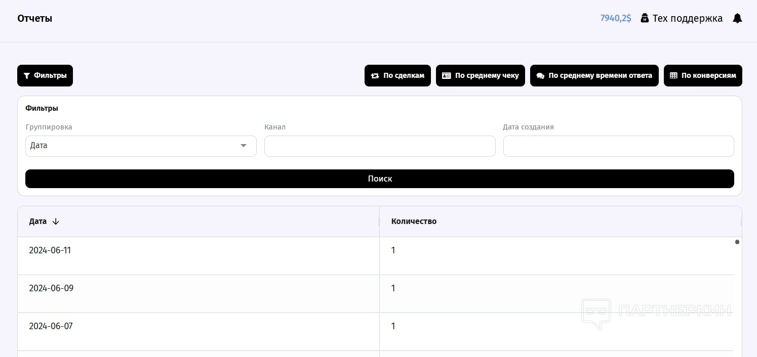 - Отслеживать эффективность их работы по отчетам, видеть среднюю конверсию из диалога в депозит на 1-й линии и сумму депозитов на 2-й, среднее время их ответа.