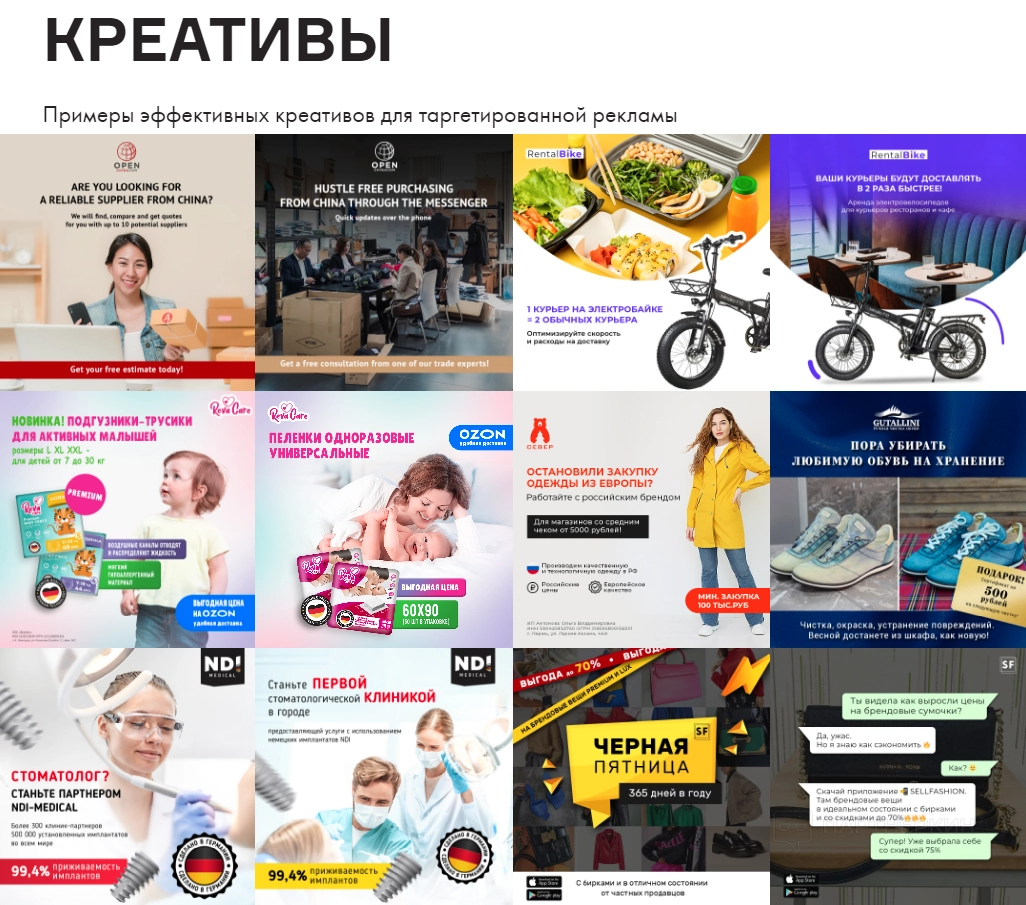 Ниже под блоком с кейсами есть вкладка, в которой находится набор с примерами креативов для таргетированной рекламы под разные направления. Можно просмотреть галерею, подобрать подходящий вариант и оценить, как приблизительно будет выглядеть креатив для рекламы будущего проекта.