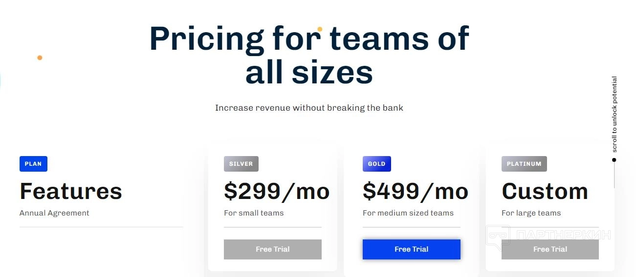 Тарифная сетка платформы различается по функционалу в зависимости от масштаба бизнеса. Хотя расценки на сайте рассчитываются, исходя из ежемесячной оплаты, требуется сразу оплачивать 1 год использования.