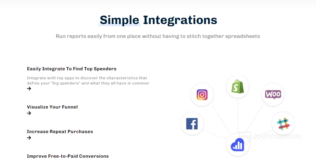 Платформа поддерживает подключение большинства популярных онлайн-инструментов для аналитики, составления отчетов, отслеживания пользовательского поведения и т.д. Среди поддерживаемых сервисов – Shopify, WooCommerce, Facebook*, Instagram* и другие.