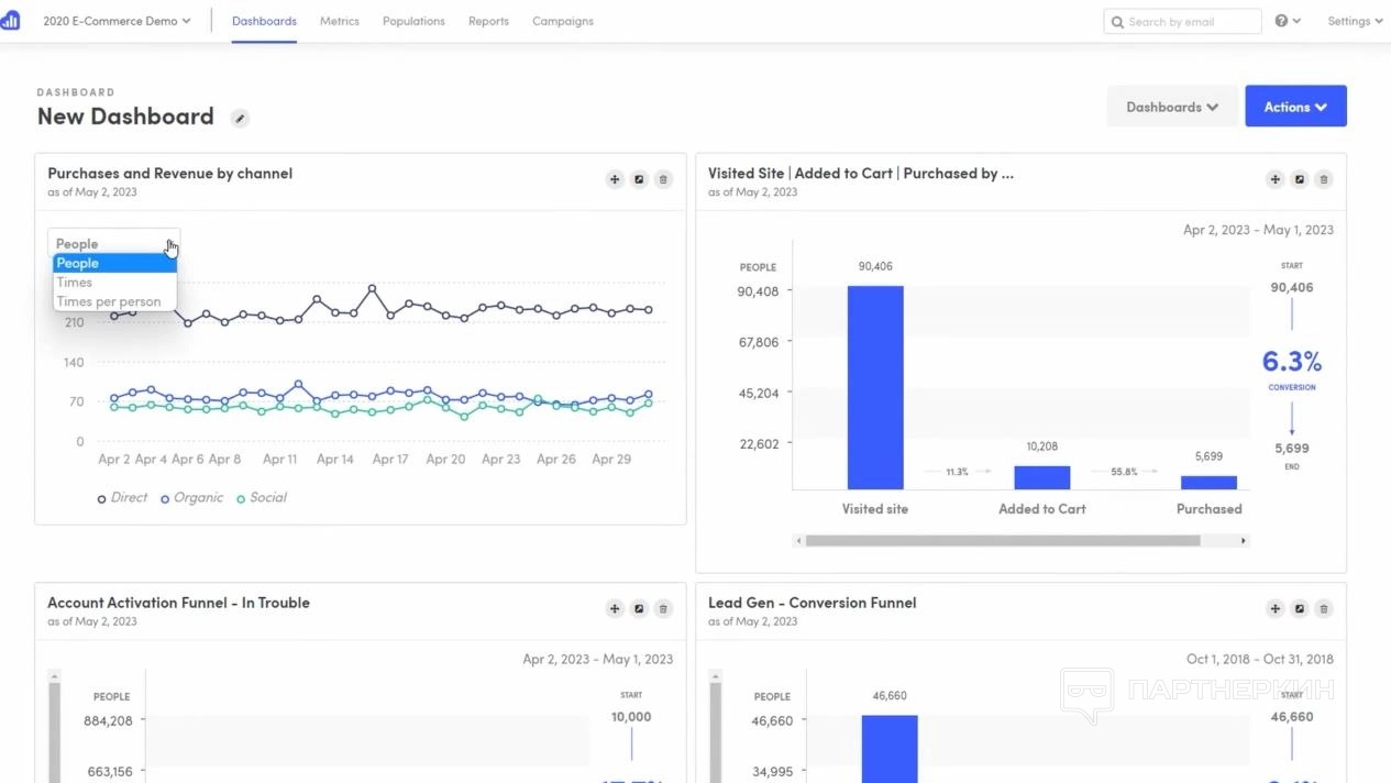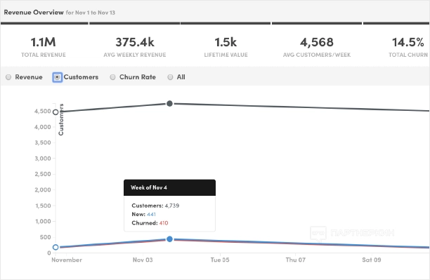 Сервис выводит всю нужную информацию, чтобы стимулировать рост бизнеса. Через платформу можно рассчитать пожизненную ценность клиента, анализировать показатели оттока, отслеживать количество клиентов. Также есть возможность определить точные продукты, приносящие доход.