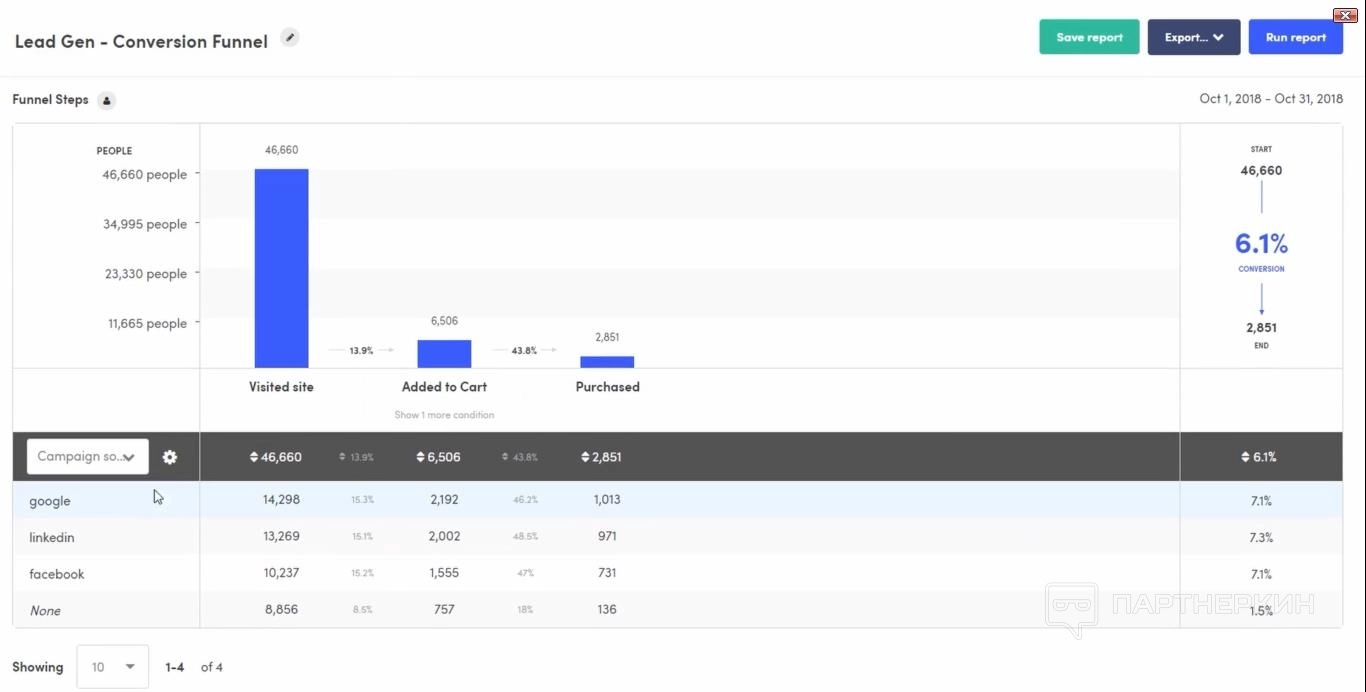 В дашборде можно отследить результативность конверсионных воронок. Отчет показывает точки отсева, показывает общий процент конверсии и результат по отдельным действиям. Можно отсортировать результаты по различным параметрам – устройству пользователя, браузеру, стране и т.д.