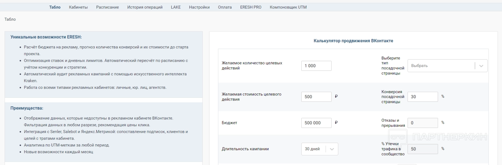 После этого пользователь сразу попадает в свое рабочее пространство в раздел «Табло» — там он может изучить основную информацию о возможностях сервиса, а также подсчитать примерную стоимость продвижения и его результаты через внутренний калькулятор.