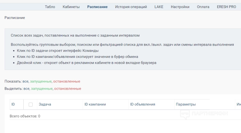 - расписание — здесь отображается список задач, которые пользователь выставлял на сервисе. Их можно фильтровать и открывать либо только завершенные, либо только запущенное, а не все сразу;