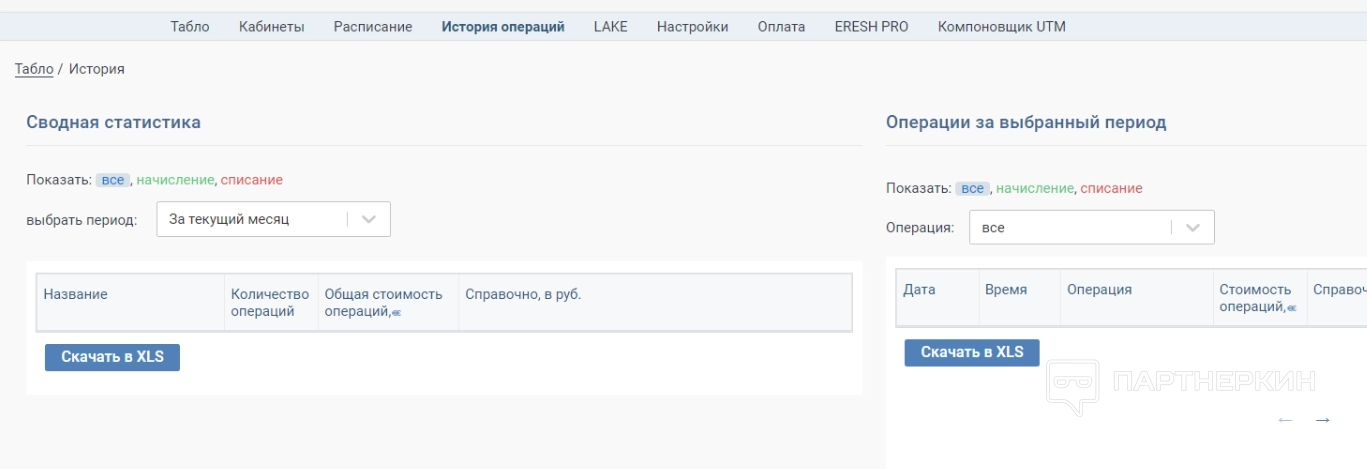 - история операций — данный раздел показывает все операции, которые проводил пользователь. Можно изучить их время, а также посмотреть только начисления или только списания. При этом вся информация может быть экспортирована;