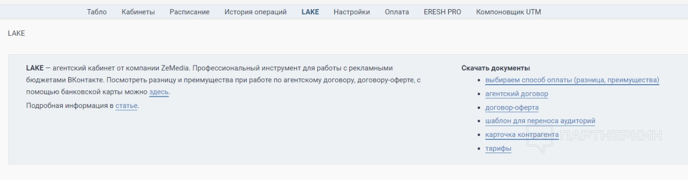 - Lake — это специальный рекламный кабинет внутри платформы. В это разделе можно изучить его подробнее, а также подать заявку на подключение;