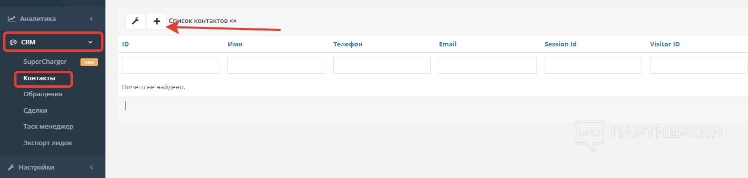 Чтобы добавить лид, переходим в раздел «CRM» и открываем вкладку «Контакты». Далее откроется страница, где нужно кликнуть на значок с плюсом. Сразу обращаем внимание на таблицу, в которой будут отображаться добавленные лиды. Фильтрация идет по таким параметрам, как ID, имя, номер телефона, электронная почта, ID сессии и ID посетителя.