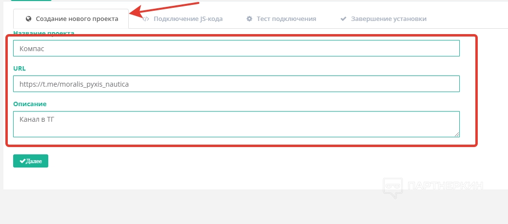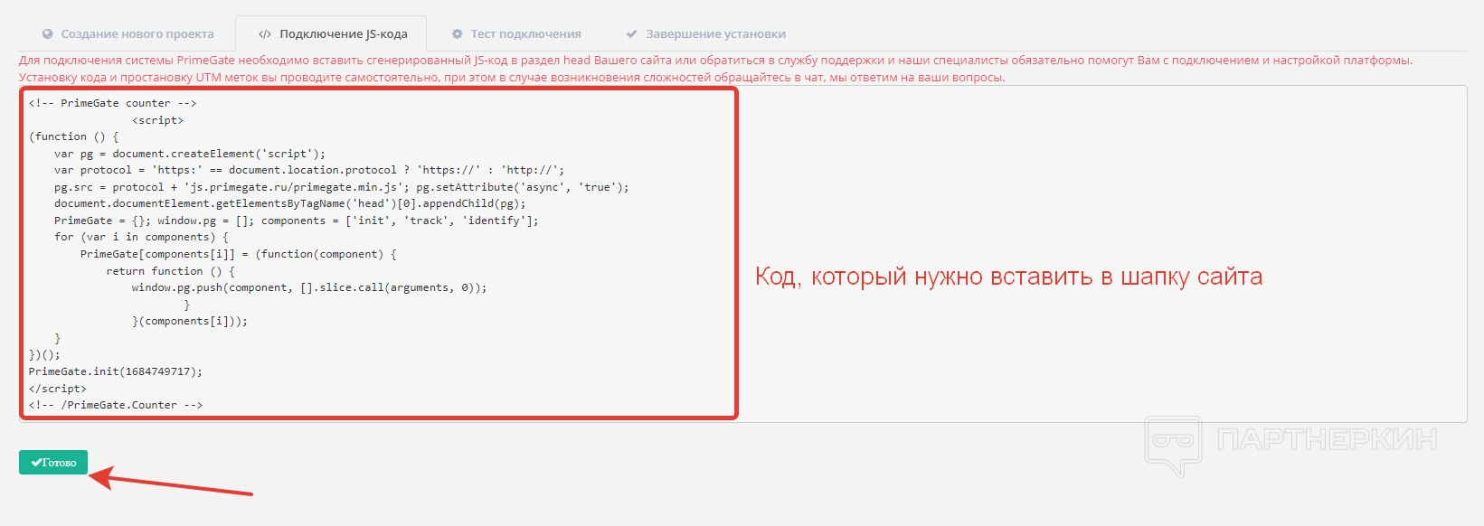 На следующем этапе откроется вкладка «Подключение JS-кода», где вебмастер найдет сгенерированный системой код, который нужно вставить в шапку своего сайта. После этого жмем на «Готово» и переходим к вкладке «Тест подключения».