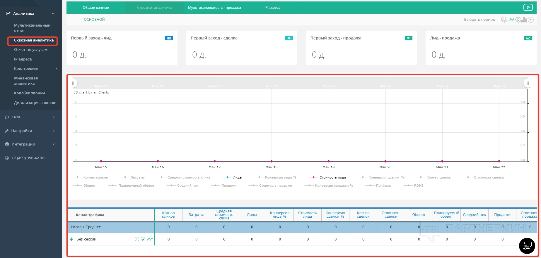 Далее идет вкладка «Сквозная аналитика», где в виде графиков и табличных данных отображаются следующие сведения: