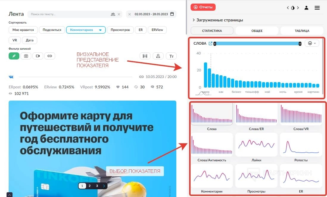 Чтобы переключаться между показателями, воспользуйтесь кнопками ниже. Кроме стандартных показателей (репосты, комментарии, ER, VR, просмотры, число записей, дни недели) доступны также следующие данные: