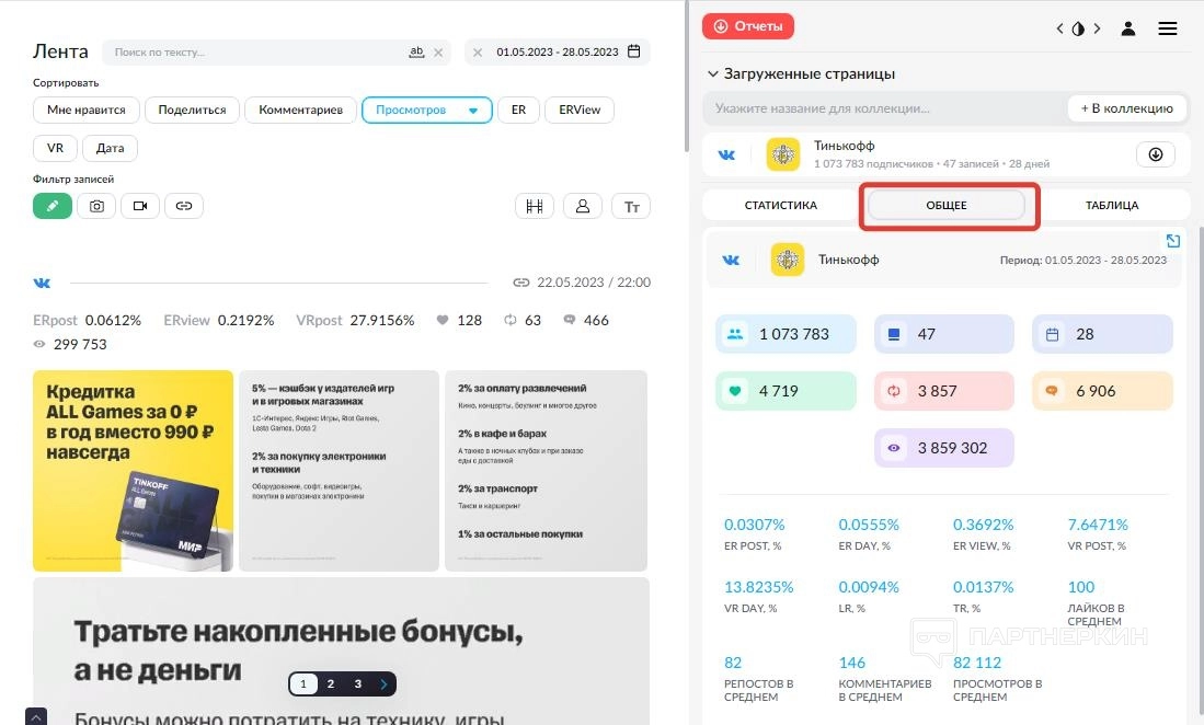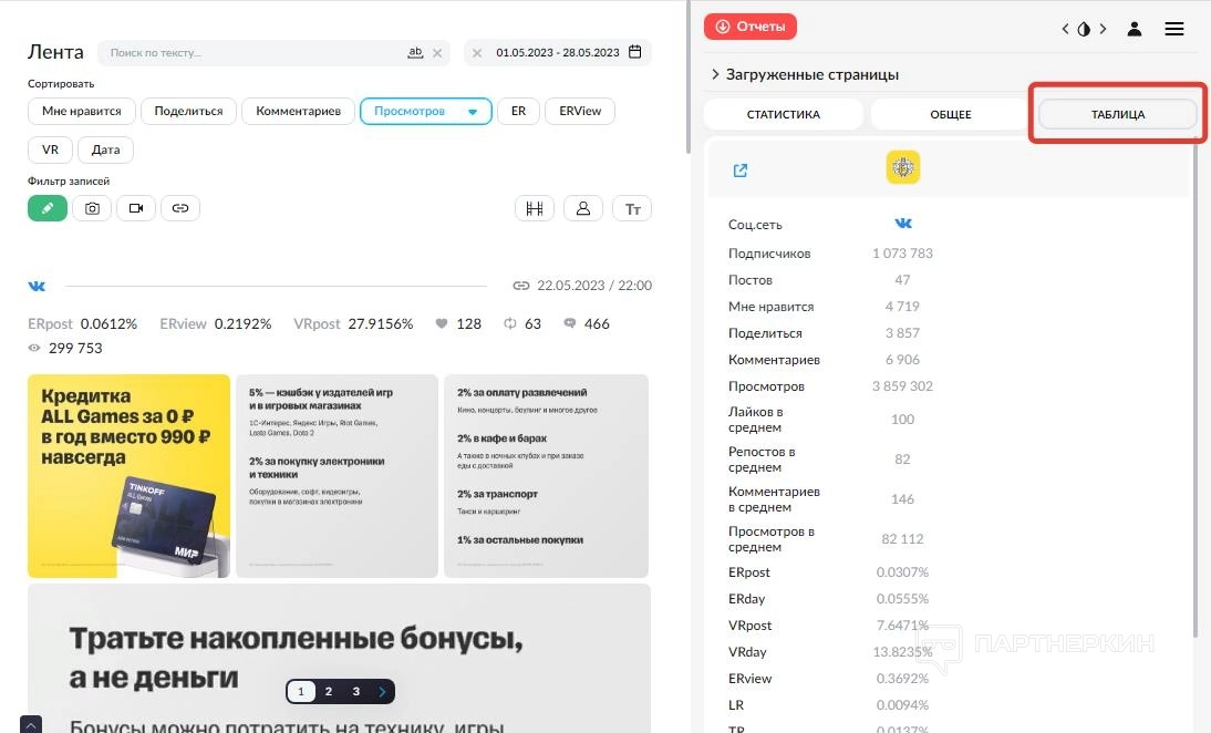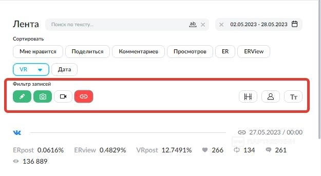 - ER. Этот параметр отражает вовлеченность пользователей (engagement rate) в определенную публикацию. В самой карточке записи отображается как ERPost.