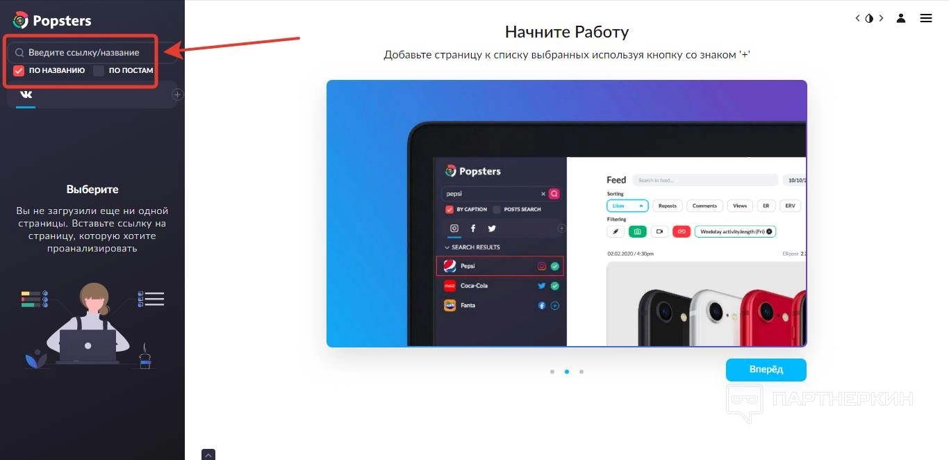 Интерфейс сайта достаточно прост в освоении. При первом входе открывается окно с кратким обучением по функционалу. Чтобы пролистать подсказки, нажимайте кнопки «Вперед».