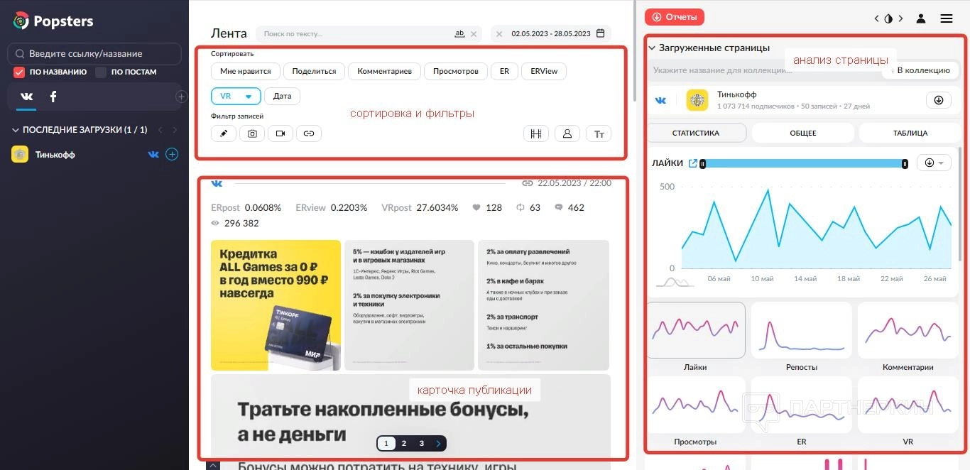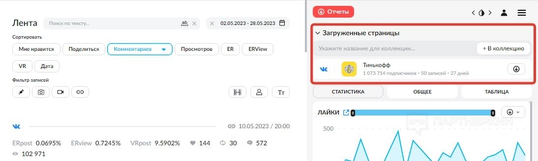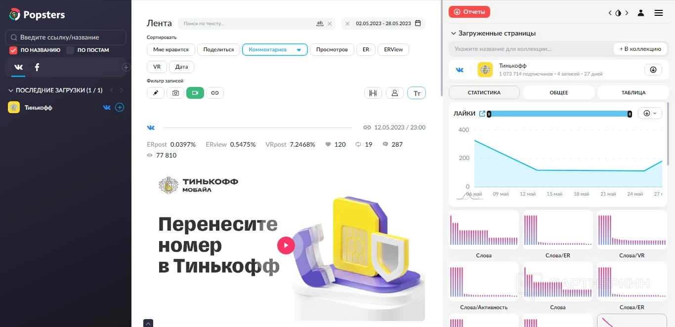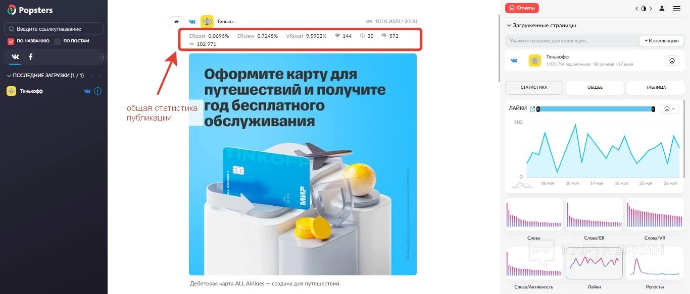Ниже находится сама карточка публикации. В верхней части указываются общие показатели, по которым проводится фильтрация и сортировка: процент вовлеченности, количество комментариев и лайков и т.д.