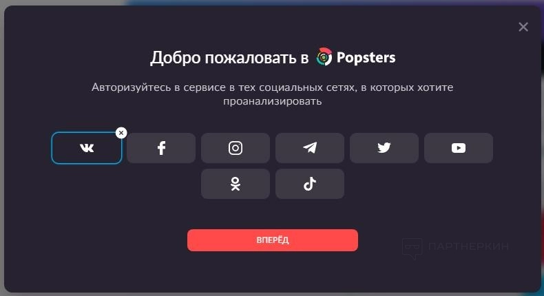 Чтобы начать работу с сервисом, требуется кликнуть по кнопке «Войти» и авторизоваться аккаунтом социальной сети, которую вы планируете отслеживать. На этом этапе можно привязать сразу несколько аккаунтов – привязанная страничка будет отмечена галочкой.