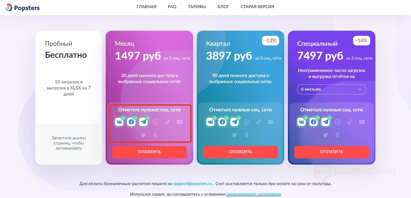 На странице тарифов выберите подходящий платежный период и отметьте галочками все нужные социальные сети. Стоимость изменится в соответствии с функционалом.