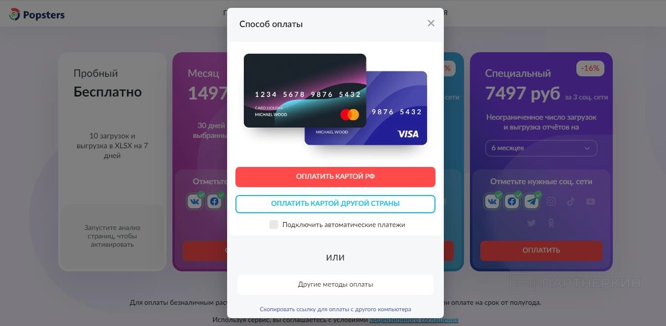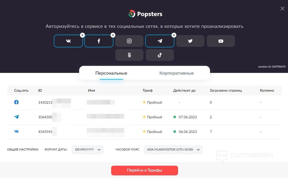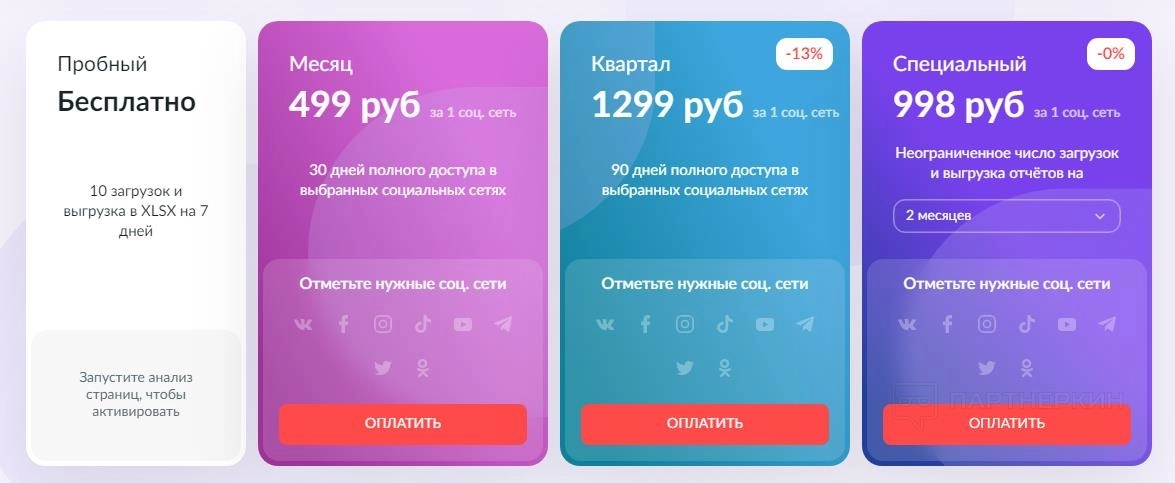 Функциями сервиса можно пользоваться бесплатно в течение 7 дней. Возможности пробной версии подразумевают 10 загрузок и выгрузку отсчетов в формате XSL. Платформа рассчитывает вход через разные соцсети как отдельный кабинет. Это значит, что каждый подключенный аккаунт может бесплатно сохранить 10 документов для выбранной социальной сети.