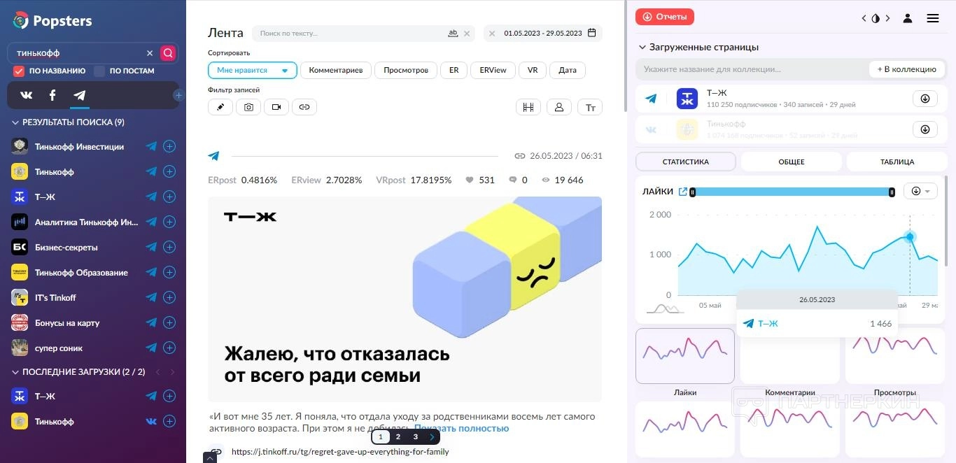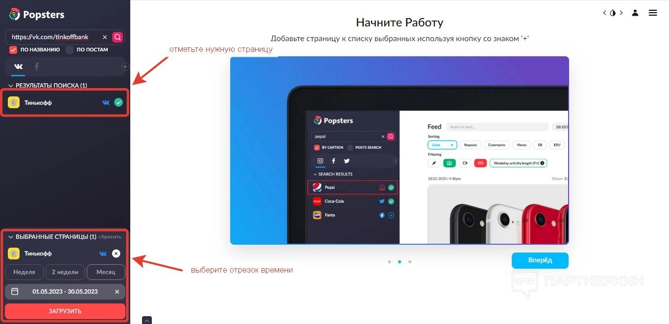 Чтобы добавить аккаунт к списку отслеживаемых, кликните по плюсу рядом с его названием. Если аккаунт добавлен, возле его названия будет отображаться зеленая галочка. Чтобы проанализировать публикации за определенный отрезок времени, выберите нужные даты в нижней части левой колонки и нажмите «Загрузить».