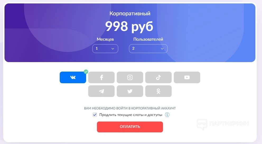 Функционал всех тарифов полностью идентичен, различается только длительность доступа. Также имеется возможность подключения корпоративного аккаунта. В этом случае стоимость рассчитывается, исходя из оплаченного периода (от 1 месяца), количества подключенных социальных аккаунтов и сотрудников (от 2 человек).
