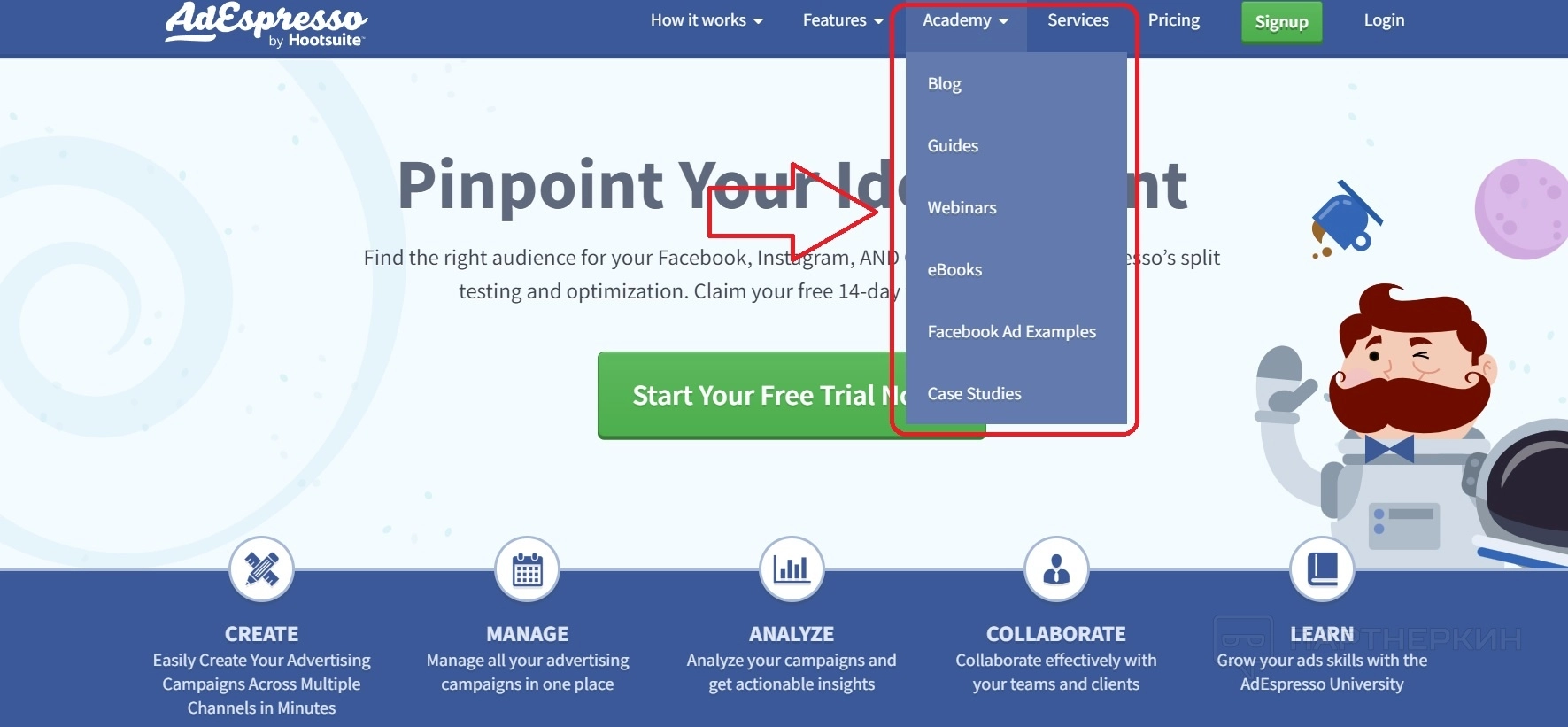 Инструмент предоставляет базу знаний и обучение своим пользователям, возможность повышать навыки и осведомленность в маркетинге. Новые учебные материалы добавляются каждый месяц. В процессе использования сервиса появляются всплывающие подсказки, которые облегчают работу новичку.