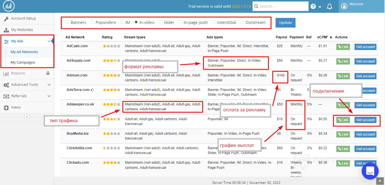 В зависимости от выбора отображаются доступные рекламные площадки с указанием цены за показ, типом трафика, видом форматов и графиком выплат. Оплата начисляется за 1000 показов. Тут же можно просмотреть рейтинг доверия пользователей к выбранной сети: рядом с названием отображается рейтинг в виде 5-ти звезд.