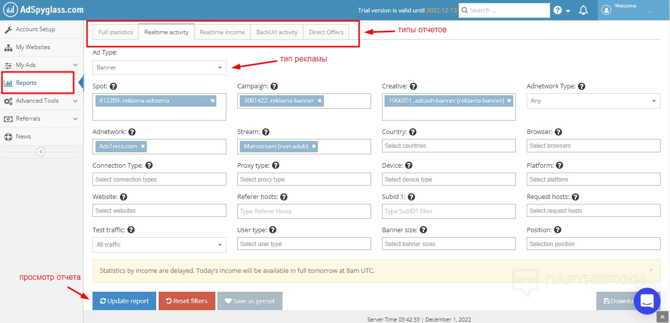 После того, как вы встроите рекламный код на сайт, станут доступны отчеты по результативности кампаний. Все данные отображаются в разделе Reports. Можно просмотреть подробные показатели: