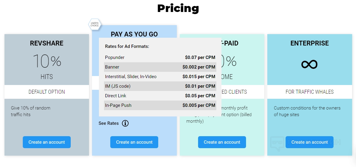 Отдельно упомянем тариф Pay as you Go. При его выборе оплата взимается в зависимости от установленного формата рекламы и рассчитывается исходя из 1 000 показов. Расценки можно увидеть на скриншоте выше.