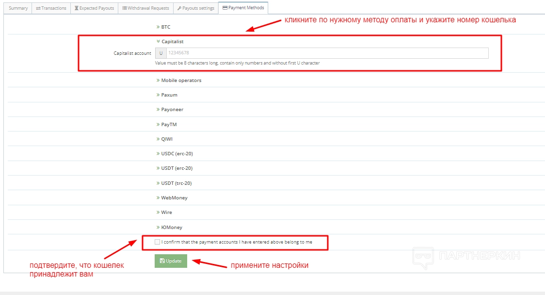 Платежные данные указываются в разделе просмотра баланса во вкладке Payment Methods. Принимаются следующие системы электронных выплат: