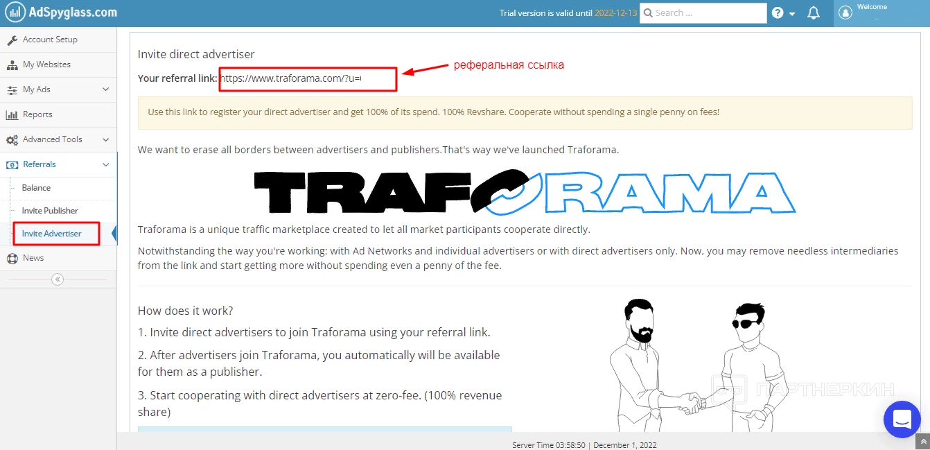 Есть реферальная ссылка для рекламодателей – она находится в разделе Invite Advertisers. В этом случае доступна только прямая реферальная ссылка. Эта реферальная программа настраивается в сотрудничестве с сайтом Traforama.