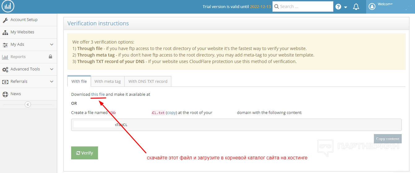 Второй шаг – верификация прав на ресурс. Для этого перейдите в My Websites и найдите кнопку Verify рядом с названием сайта. Вам предложат скачать файл, который нужно загрузить в корневую папку домена. Можно выбрать другой способ подтверждения – вставить мета-тег в секцию <head> главного php-файла или внести TXT-запись в DNS-данные домена.