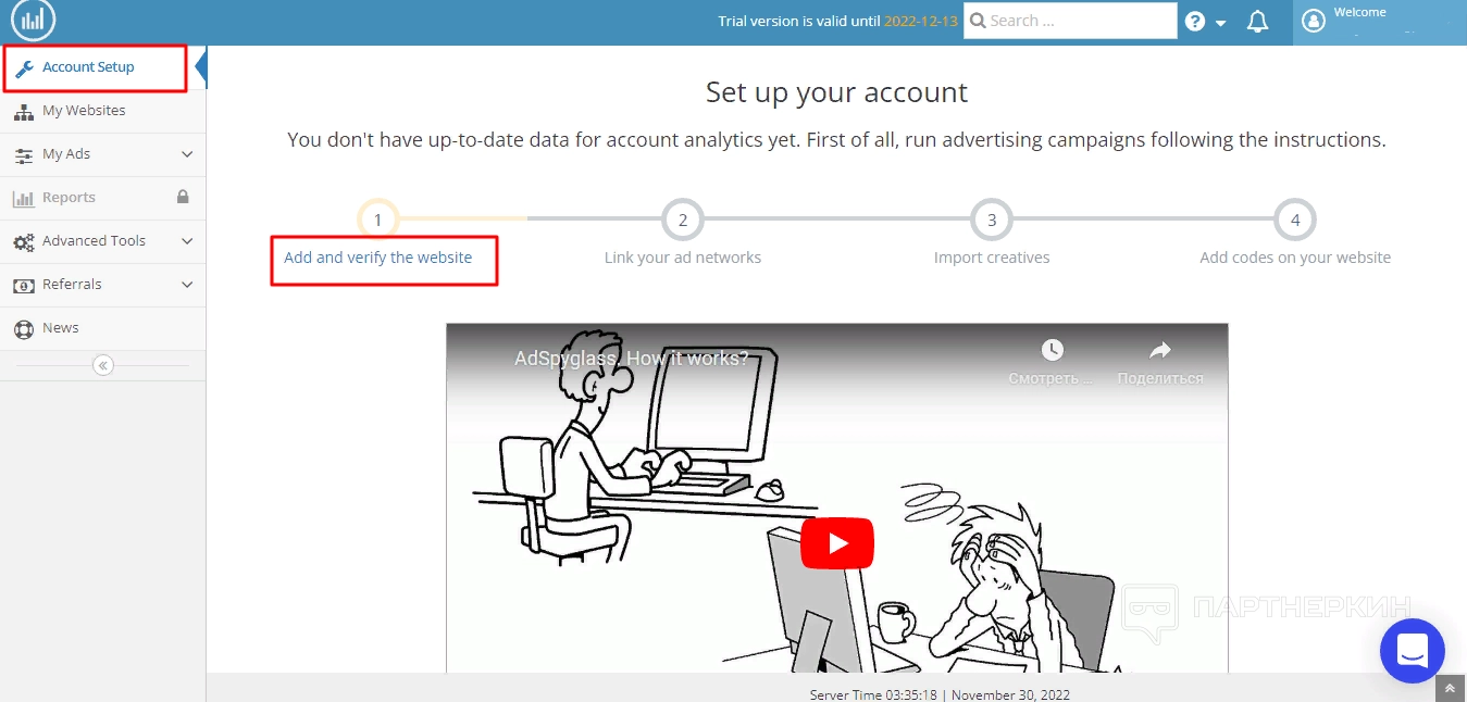 - Сразу после авторизации вы будете направлены на страницу Account Setup. Если этого не произошло, раскройте нужную вкладку в панели слева и щелкните Add and verify the website.